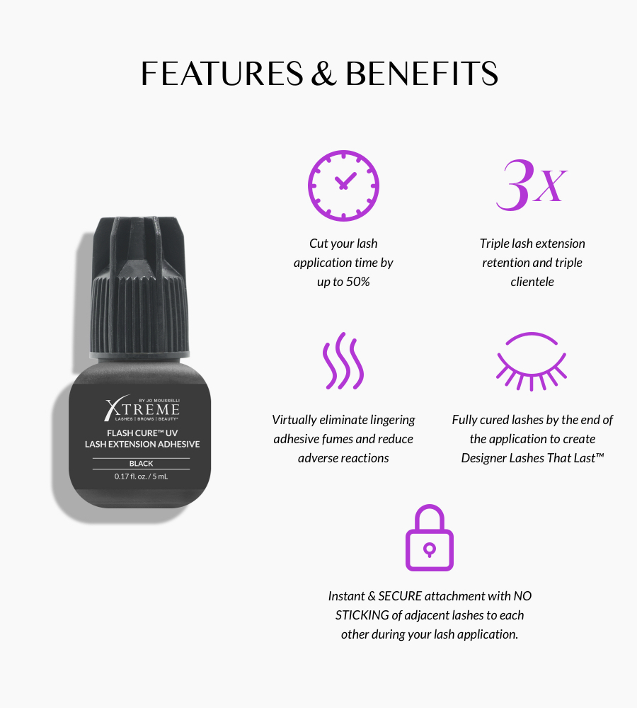 Coșmarul fiecărui specialist în aplicarea extensiilor de gene sunt clienții nemulțumiți pentru că seturile nu sunt rezistente și genele false cad. Gata cu stresul, adezivul Xtreme Lashes Flash Cure este unul dintre cele mai rezistente materiale de pe piață, cu ajutorul căruia poți construi seturi uimitor de rezistente!